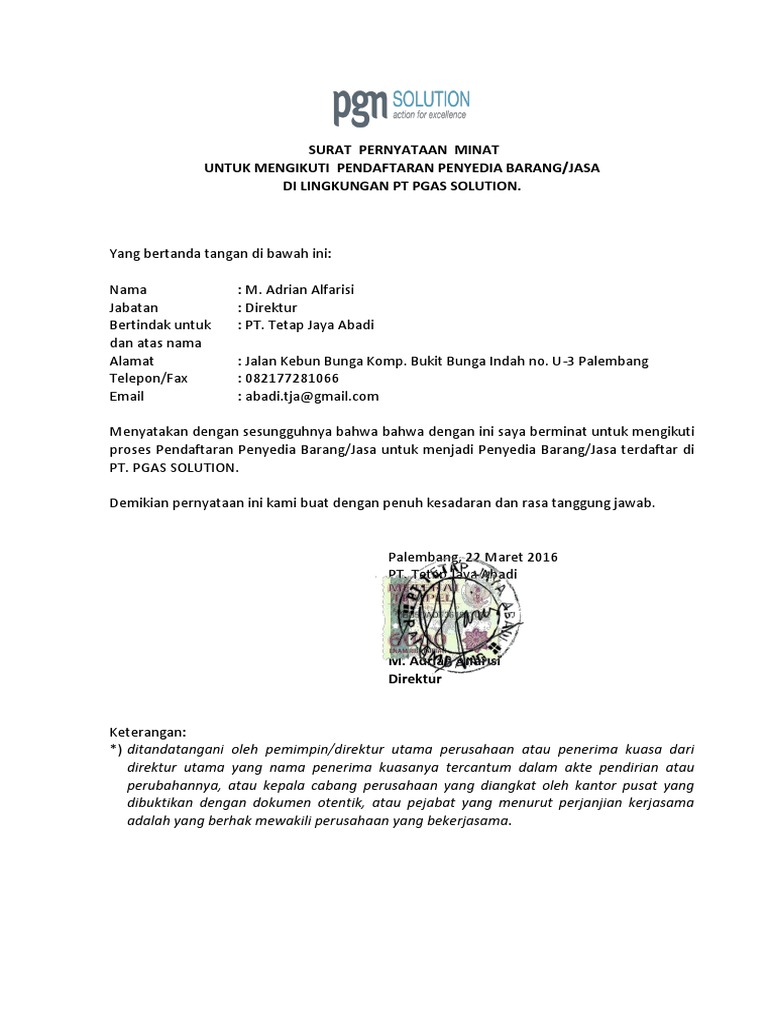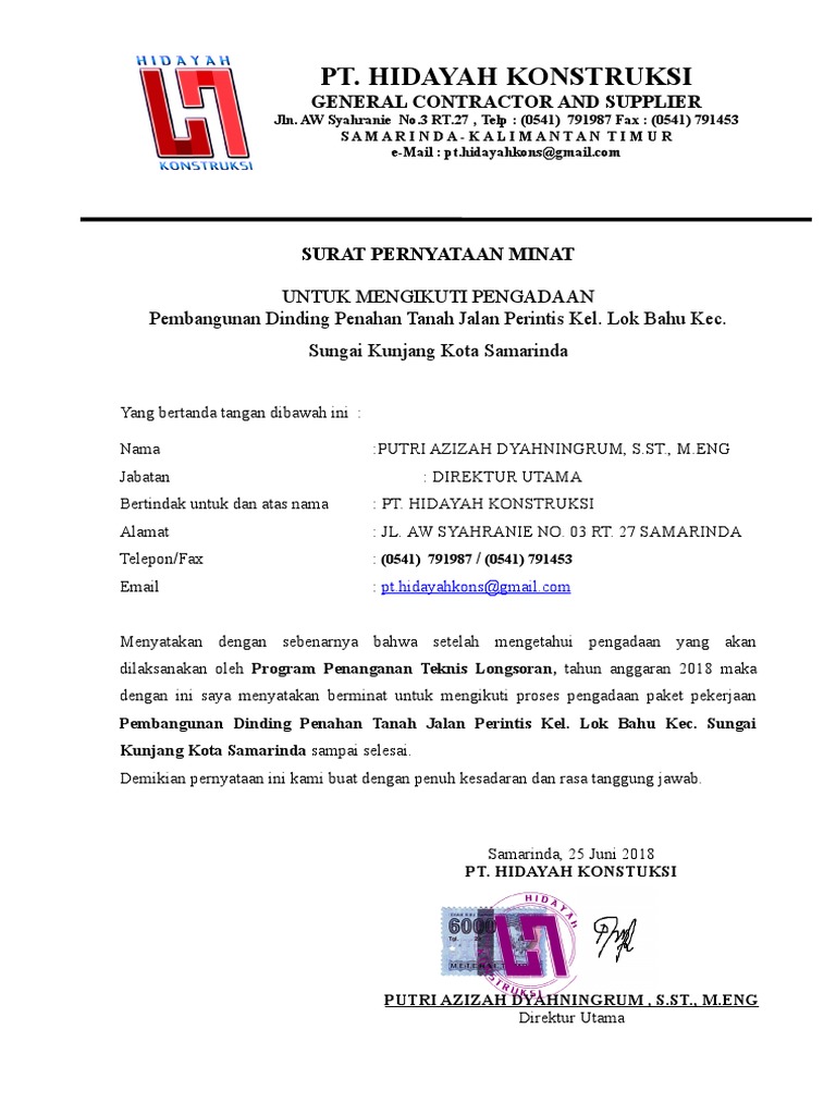 Contoh Surat Pernyataan Minat Untuk Mengikuti Lelang