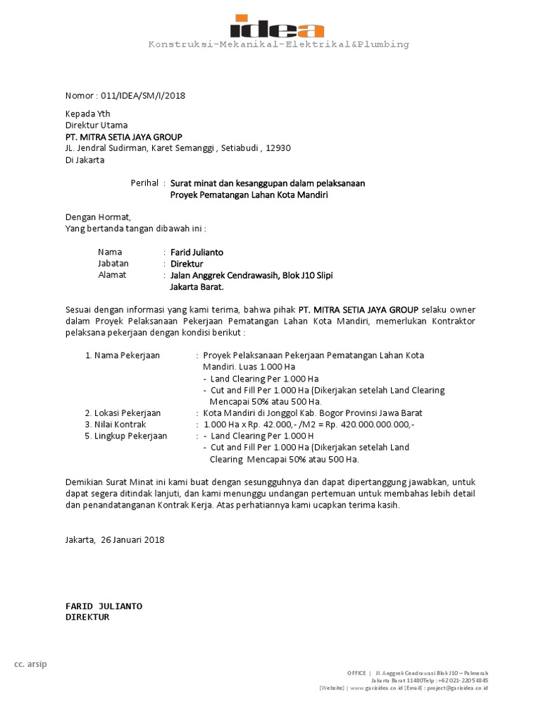 Mereka mulai sadar di keadaan sekarang harusnya ada tabungan, ada investasi. Surat minat proyek merupakan bagian dari jenis surat minat atau lebih dikenal dengan nama letter of intent (loi) yang bertujuan untuk menunjukkan ketertarikan sekaligus komitmen seseorang atau perusahaan terhadap sesuatu hal dalam bisnis, baik untuk membeli, untuk ikut berpartisipasi dalam suatu bisnis atau keinginan apapun dari suatu entitas bisnis terhadap relasi bisnisnya. Tema itu diangkat dalam diskusi media dentons hprp bertajuk 'iklim investasi dan bisnis dari perspektif hukum' di wisma 46, jakarta, rabu (24/7).