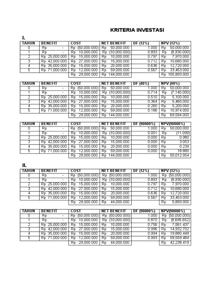 ∑ ∑ − = = = + n i n n i i nb npv atau npv nb i 1 (1) b dimana: A short summary of this paper. Berdasarkan tabel di atas jenis investasi manakah yang harus dipilih jika digunakan kriteria maksimaks ?