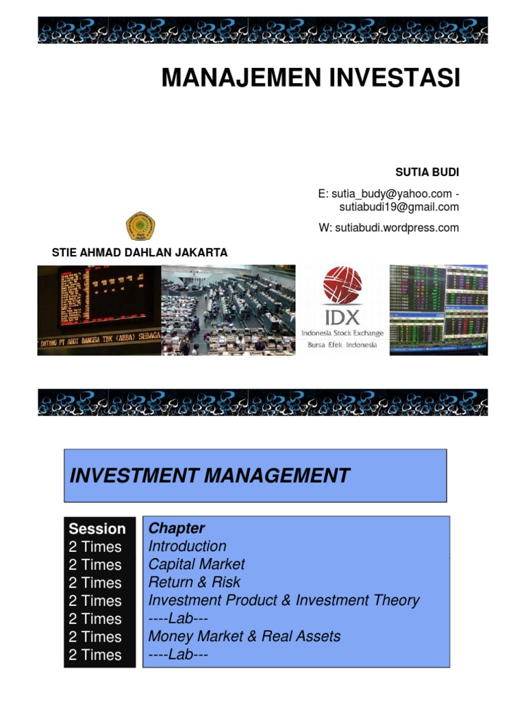 Manajemen investasi yang dapat digunakan baik oleh tenaga pengajar, mahasiswa, maupun pembaca pada umumnya untuk menambah wawasan dan ilmu berkenaan dengan manajemen investasi. Investasi portofolio dan manajemen investasi pada dasarnya investasi portofolio merupakan penanaman modal yang dilakukan oleh para investor melalui pasar modal baik dalam bentuk saham maupun surat utang seperti obligasi. Pasar efek pasar efek (securitas market) merupakan mekanisme yang memungkinkan penawar dan peminta dana melakukan traksaksi penjualan dan pembelian sekuritas.