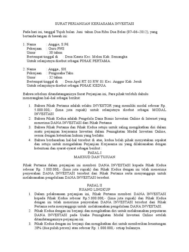 Surat perjanjian kerjasama investasi doc. Surat perjanjian kerjasama investasi pada hari ini tanggal tujuh bulan juni tahun dua ribu dua belas 07062017 yang bertanda tangan di bawah ini. Surat perjanjian kerjasama usaha bersama contoh surat perjanjian kerjasama usaha bersama ini dibuat dan disepakati oleh pihak pihak yang ingin melakukan kerjasama dibidang usaha tertentu dimana sistem pembagian keuntungannya berdasarkan bagi hasil sehingga sesuai dengan syariat islam. Perjanjian antar dua pihak ini biasa dikenal dengan istilah memorandum of understanding (mou).