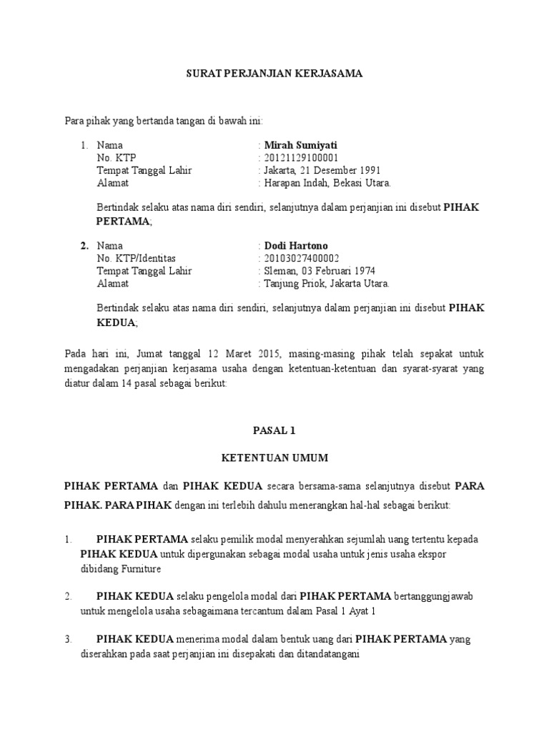 3 perpanjangan perjanjian ini disusun dalam surat perjanjian yang baru bermaterai baru. Surat perjanjian kerjasama investasi dawet raja bismillahirrahmaanirrahiim yang bertanda tangan di bawah ini : Bisnis pasti membutuhkan kerjasama antara beberapa pihak.