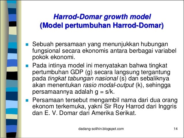 Teori ini dicetuskan oleh evsey domar dan roy harrod, yang bekerja terpisah namun menghasilkan kesimpulan yang sama bahwa pertumbuhan ekonomi ditentukan oleh tingginya tabungan dan investasi. C adalah tambahan kapital atau perbandingan antara investasi dan kenaikan pendapatan (i/dy) dan s adalah tabungan. Tinggi dibandingkan perekonomian dengan tingkat tabungan lebih rendah.