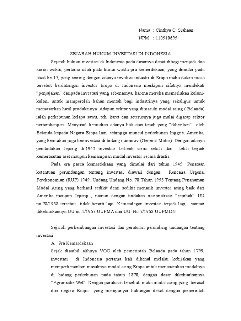 Di surabaya pada hari sabtu, tanggal12 juli 2008. Investasi secara harfiah diartikan sebagai aktifitas atau kegiatan penanaman modal, sedangkan investor adalah orang atau badan hukum yang mempunyai uang untuk melakukan investasi atau penanaman modal.1 kegiatan penanaman modal bukanlah hal yang baru dalam peradaban manusia, karena sudah sejak zaman dahulu masyarakat sudah melakukan. Pra dan pasca kemerdekaan —pra penanaman modal pertama kali dilakukan di indonesia melalui kebijakan pemerintah hindia belanda yang memperkenankan masuknya modal asing eropa untuk menanamkan usahanya di bidang perkebunan pada tahun 1870 terjadinya pengambilalihan hak dan kewajiban badan usaha voc oleh pemerintah belanda pada tahun 1799 mengakibatkan pemerintah belanda mulai terjun secara.